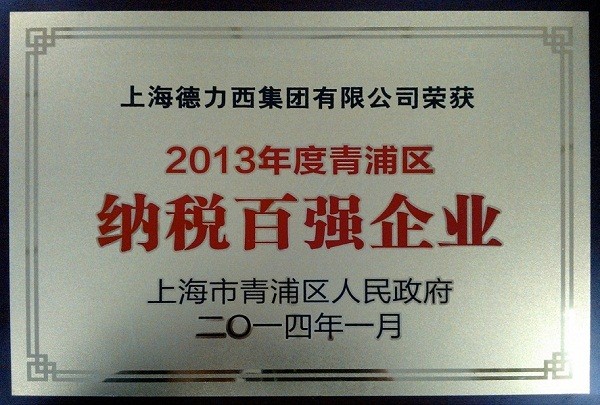 2014 年1 月24 日,2013年度青浦區納稅百強企業表彰會在青浦工業園區隆重舉行。青浦區委書記高亢,區委副書記、區長趙惠琴等領導出席表彰會。上海德力西集團被授予“2013 年度上海市青浦區納稅百強企業”榮譽稱號。上海德力西集團監事會副主席林少東出席大會領獎。